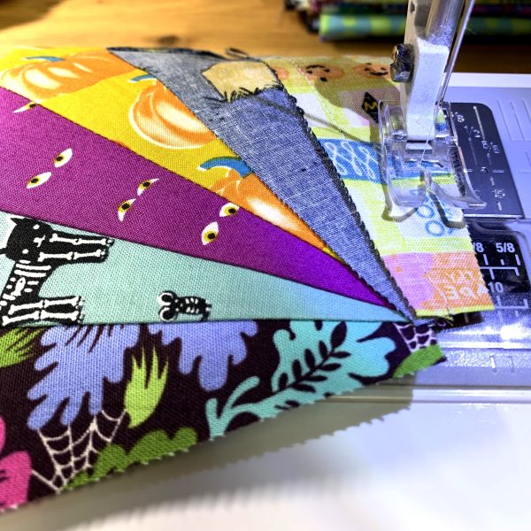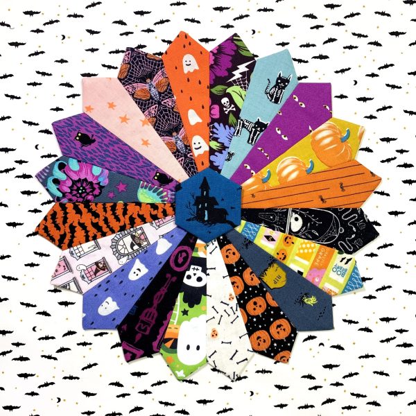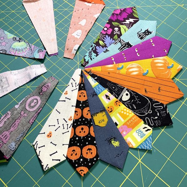 Worked on another Halloween Dresden plate quilt block today. I pulled most of these prints from my Halloween scrap bin since small-ish scraps are perfect for Dresden quilt blocks. (It’s a great stash-busting pattern! Shameless plug.) I have a decently-large Halloween fabric stash, and whenever I cut into prints for a project, I make sure to throw any scraps larger than about 3″ into a cheap, open-top bin I found at Target a few years ago. The scraps accumulate quickly, and it’s fun to rummage through them to find a variety for a project such as this. Sometimes you manage to find a real treasure towards the bottom of the bin, like that Cotton + Steel haunted house print that I used for the center hexagon. I had a scrap *just* large enough to fussy cut. What a treat!