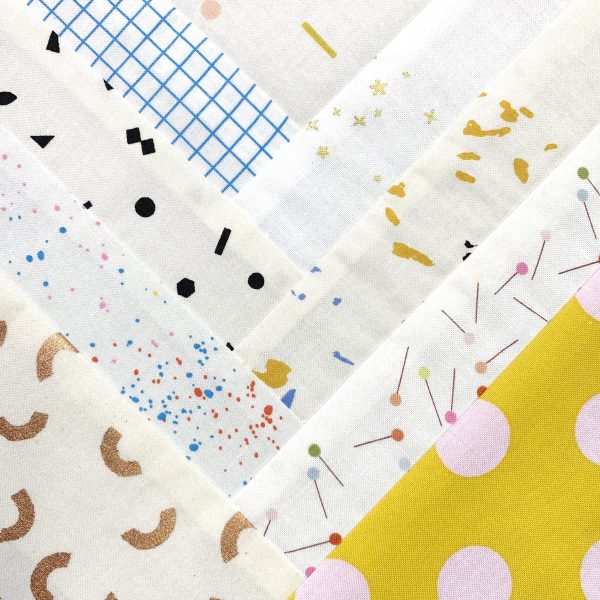 There are so many projects that I should be working toward finishing, but I couldn’t help cutting into something new today. I’ve been staring at a gorgeous low-volume bundle for weeks just waiting for inspiration to strike, and strike it did. I’m pairing the bundle with a ton of Tula Pink solids and All Stars scraps that I have left over from a previous project, and they’re a match made in heaven. I decided to use my Quarter Log Cabin pattern and use pops of bright color like confetti. The effect is beautiful and lots of fun.