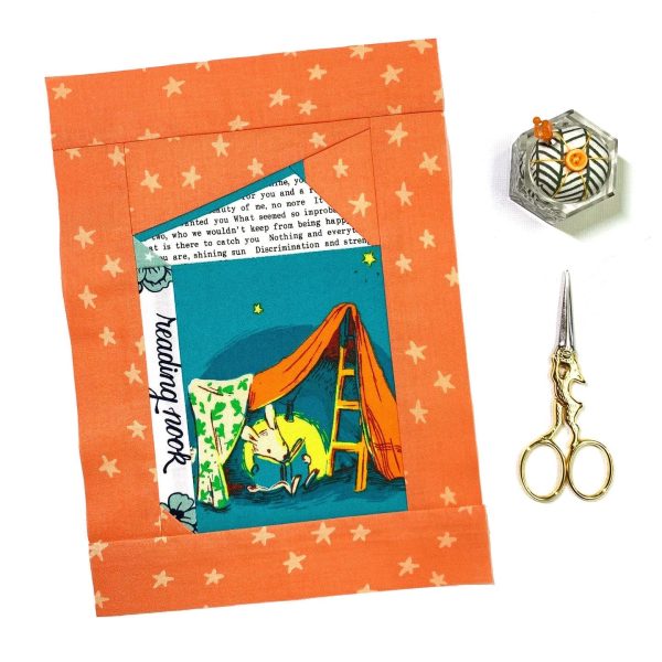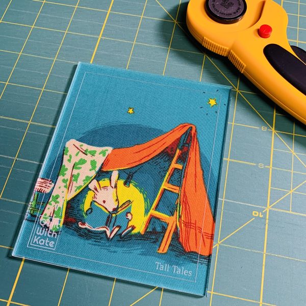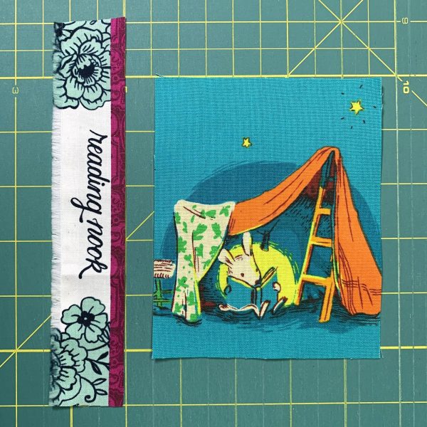 Step 1: First and foremost, I recommend a book cover fabric that feels like a good match to the words on your selected selvage. For example, I chose a print from Heather Ross’ collection Lucky Rabbit that features a sweet, little bunny reading a book under a homemade tent. The fabric selvage I’ve decided to pair with it reads “Reading Nook.” A great match! To get just the right fussy cut for the book cover, I use my Tall Tales acrylic template (available in my Etsy shop!), align the the template over the fabric portion I want to use, and trim around the template. Voila! A fussy-cut book cover!