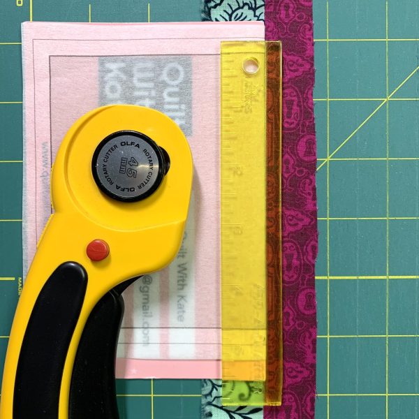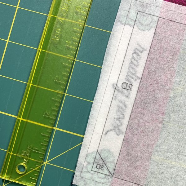 Step 4: Fold the paper over the notecard, as you do when foundation paper piecing, place your Add-a-Quarter ruler against the edge of the notecard, and trim the excess selvage. This creates the seam allowance for when you sew pieces 1D and 2D together.